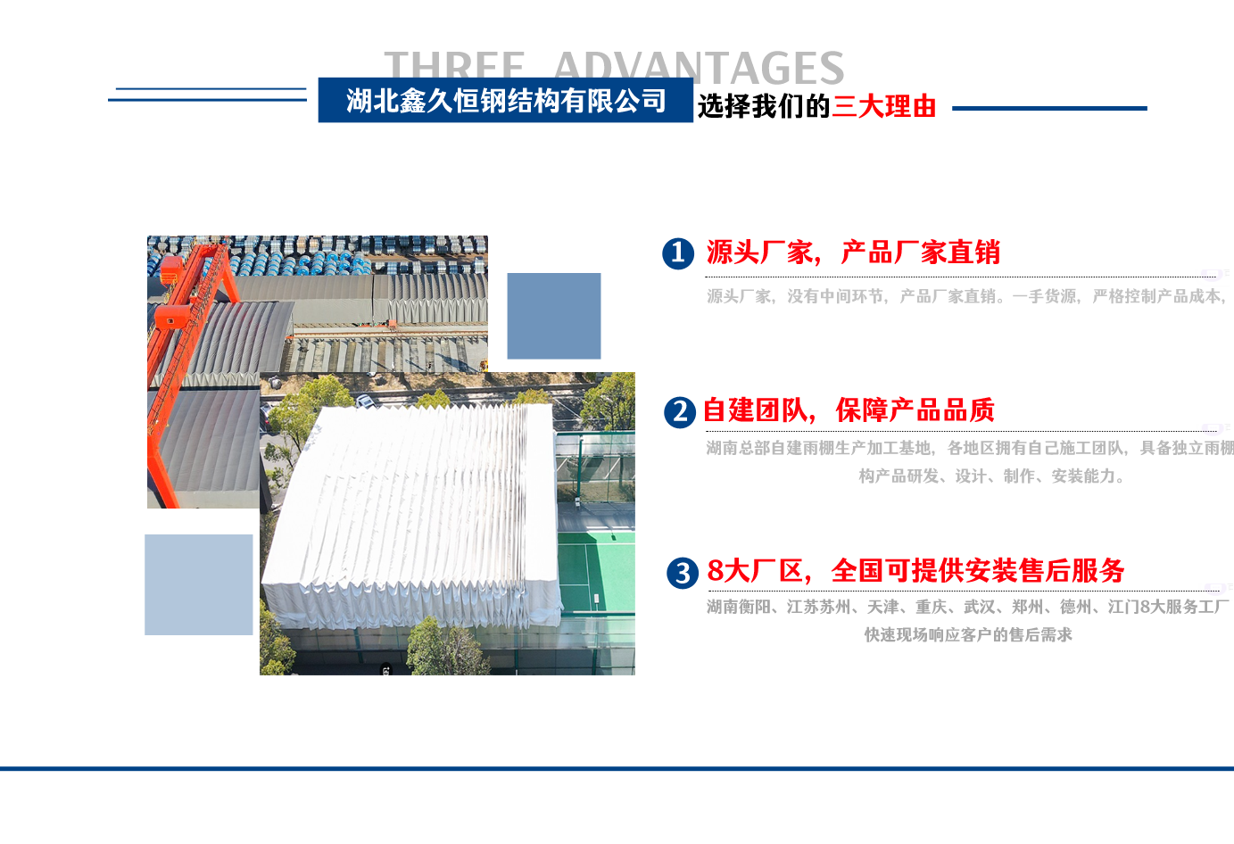 湖北鑫久恒鋼結(jié)構(gòu)有限公司是一家電動(dòng)雨棚、膜結(jié)構(gòu)車棚研發(fā),生產(chǎn)銷售,施工安裝于一體的專業(yè)鋼結(jié)構(gòu)科技公司,主要產(chǎn)品有伸縮雨棚,電動(dòng)雨棚,膜結(jié)構(gòu)車棚等。 湖南地區(qū)職員目前有80多人,占地面積20000平方米,廠房面積15600平方米,配備先進(jìn)的生產(chǎn)流水線,使每件品質(zhì)產(chǎn)品的堅(jiān)實(shí)基礎(chǔ)?! 」驹谔K州、天津、重慶、武漢、德州、烏魯木齊、江門均設(shè)有服務(wù)工廠,總?cè)藛T共300多人,擁有專業(yè)的技術(shù)團(tuán)隊(duì),配備先進(jìn)的設(shè)備和流水線生產(chǎn),產(chǎn)能高,貨源充足,發(fā)貨速度快,服務(wù)區(qū)域廣?! ∫苿?dòng)伸縮棚適用于通道臨時(shí)倉儲(chǔ)、戶外運(yùn)動(dòng)遮陽、污水池遮蓋、能源交通、熱力化工、礦山、船舶制造及市政建設(shè)、物流、碼頭等領(lǐng)域的構(gòu)件制作加工,成品半成品存放、倉庫、野外儀器設(shè)備操作用房等。尤其是對(duì)工廠發(fā)貨、倉儲(chǔ)臨時(shí)遮雨防嗮,梅雨期較長、建設(shè)周期較短的工程施工等特別適用。還可根據(jù)用戶需求量身定制、適合企業(yè)所需不同款式的產(chǎn)品?! ∥夜緢?jiān)持“誠信社會(huì)為本,客戶滿意為榮”的經(jīng)營理念,做到質(zhì)量把控,嚴(yán)格管理,精益求精,恪守承諾。使鑫久恒逐步走向成熟,其系統(tǒng)化、專業(yè)化日趨完善。以專業(yè)的技術(shù)、科學(xué)的管理,更高的產(chǎn)品質(zhì)量,優(yōu)良的企業(yè)信譽(yù),真誠的客戶服務(wù),靈活多樣的經(jīng)營方式和務(wù)實(shí)創(chuàng)新的企業(yè)精神愿與社會(huì)各界攜手合作,為推動(dòng)智能鋼結(jié)構(gòu)建筑事業(yè)的發(fā)展而不斷努力。...